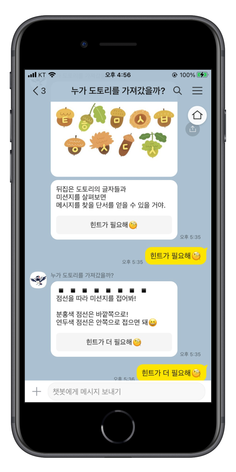 금고 속에는 '누가 도토리를 가져갔을까?' 챗봇프로그램의 미션지가 있다.