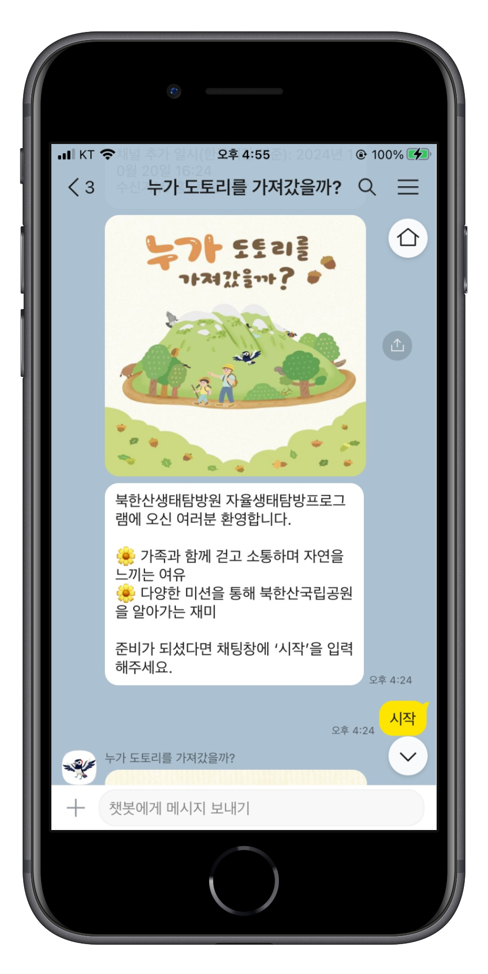 도봉산에 위치한 북한산국립공원 생태탐방원에 방문해서 아이와 함께 챗봇프로그램을 해봤습니다. 비대면 챗봇 프로그램 '누가 도토리를 가져갔을까?'의 후기를 남겨봅니다.