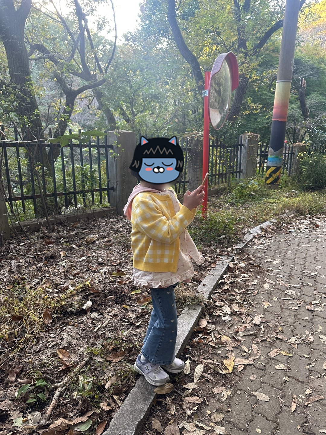 등산로를 따라 잠시 걷다가 코너에서 전봇대 2개와 거울이 있는 곳을 찾는다.